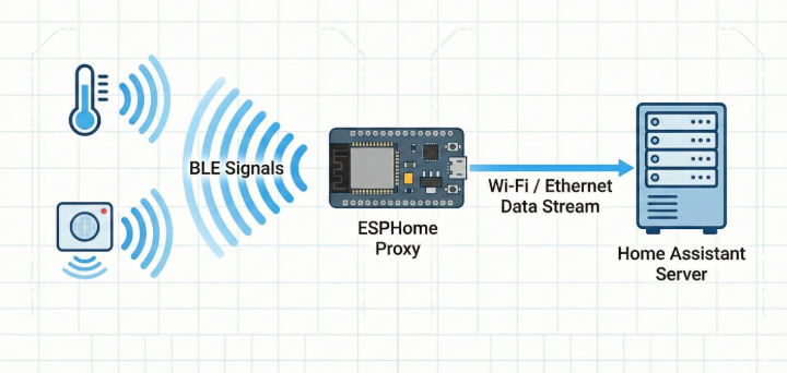 A Bluetooth proxy works by placing small ESP32-based nodes near Bluetooth devices and forwarding the collected data to a central server over the network.