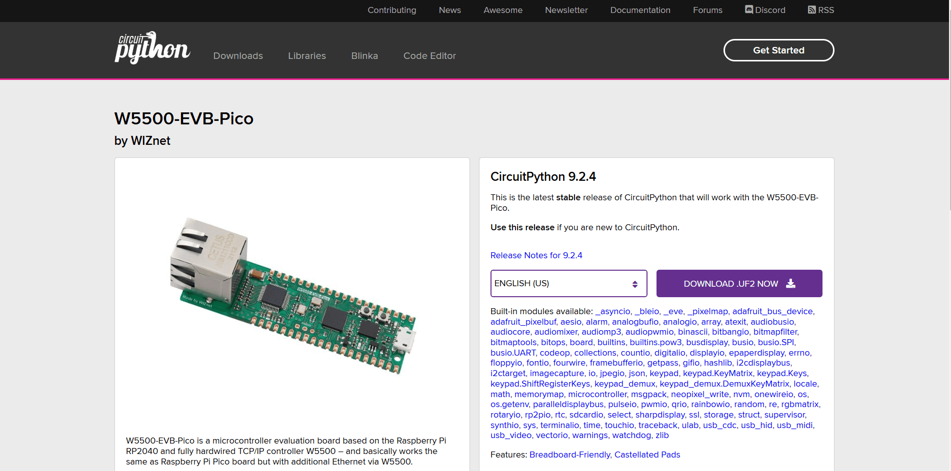 - To start, go to the CircuitPython page for the W55RP20-EVB-Pico. Scroll down to the "Downloads" section and click on the link to download the latest CircuitPython firmware for the board.