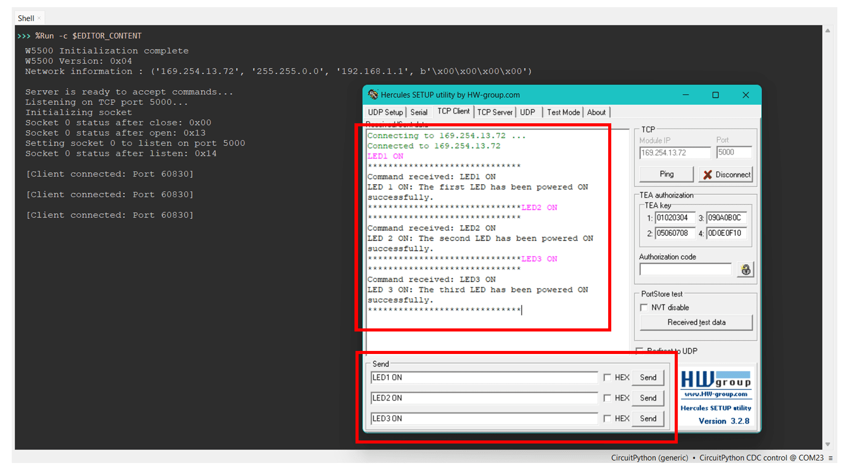 For this section, we will be using a TCP server to control the LED. Unlike the conventional method of using a webpage, we’ll be using Hercules, a TCP/UDP terminal client, to send commands.