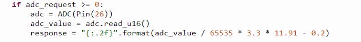 The ADC on the RP2040 has a resolution of 12 bits, but the representation is changed to 16 bits. In other words, the value read by adc must be divided by 65535 and multiplied by 3.3V to output the actual input. And the exact resistance I put on is 36k + 3.3k = 39.3k. Therefore, the actual voltage value that can be expressed is 39.3V instead of 40V.