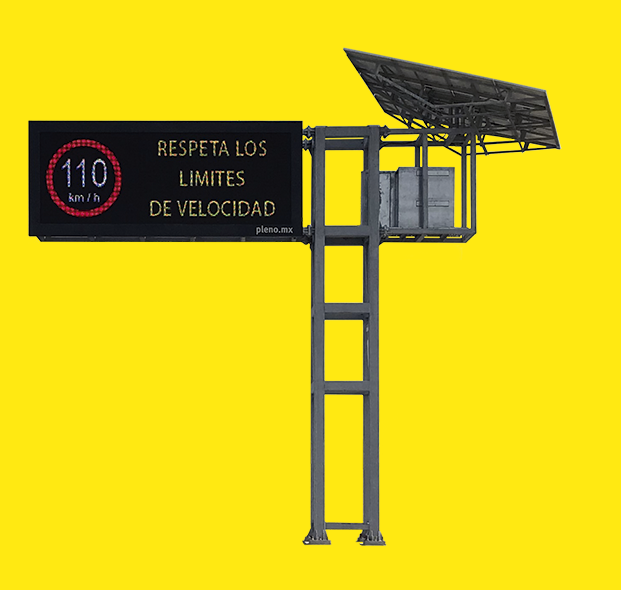 Devices are managed through native software connected to the company cloud platform at Plenolab.com, allowing centralized 24/7 control of multiple traffic signs.