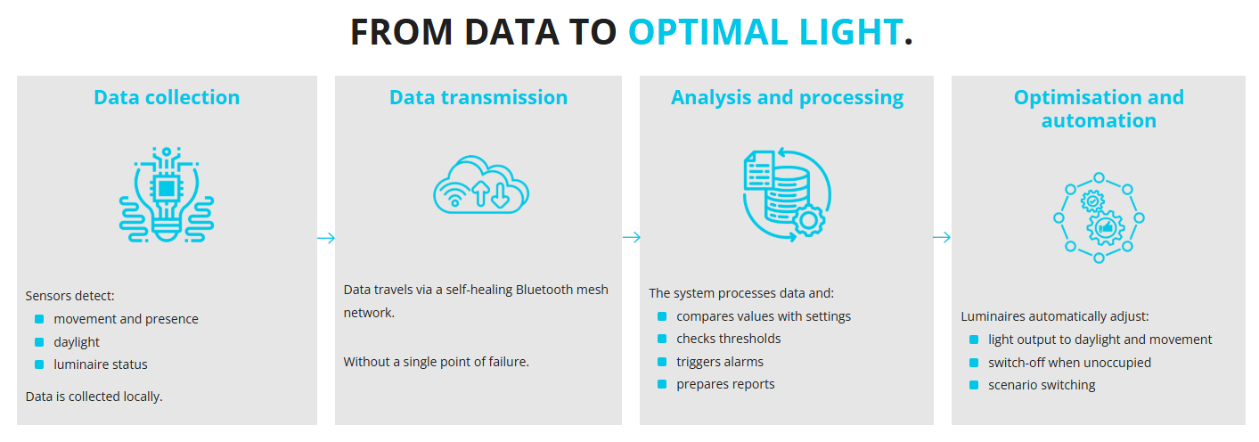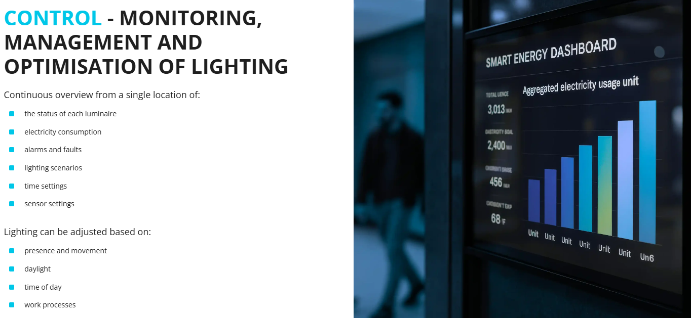 These capabilities allow building operators to manage lighting systems more efficiently while supporting broader smart building automation strategies.