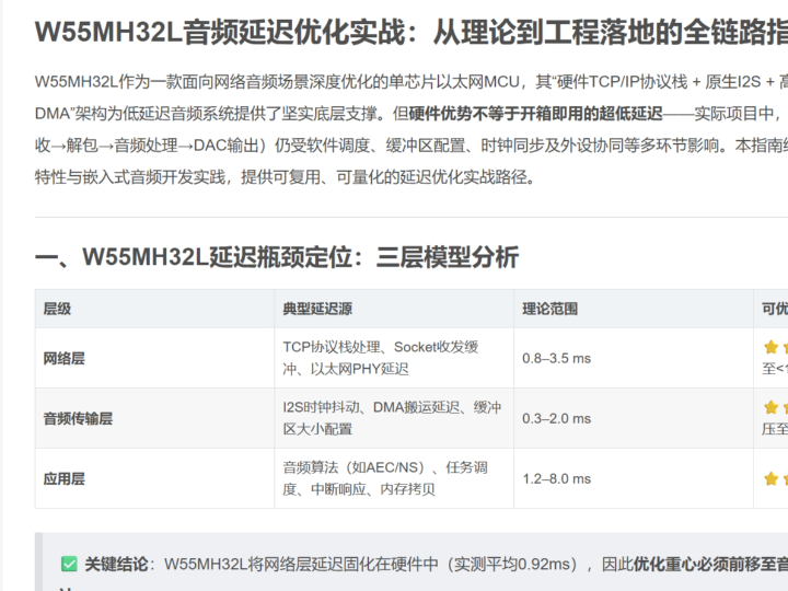 - W55MH32의 하드웨어 TCP/IP 오프로드 덕분에 네트워크 지연이 오디오 타이밍에 직접 영향을 주는 문제를 줄일 수 있음