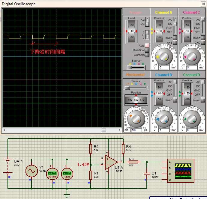 The following program acquires the voltage signal from port PB0 (Figure 1.2.1). Due to the low frequency and the requirement that the relay output time be less than 35ms, the frequency is calculated using the period measurement method. The main timer configuration and timer interrupt routines are given. Because the rising edge is not steep when tested with an oscilloscope (as can be seen in the simulation diagram in Figure 1.1.1), two falling edges of one cycle are used. Note: Subsequent processing programs must capture both falling edges before appropriate processing can be performed. Processing will fail if the acquisition program is not completed.