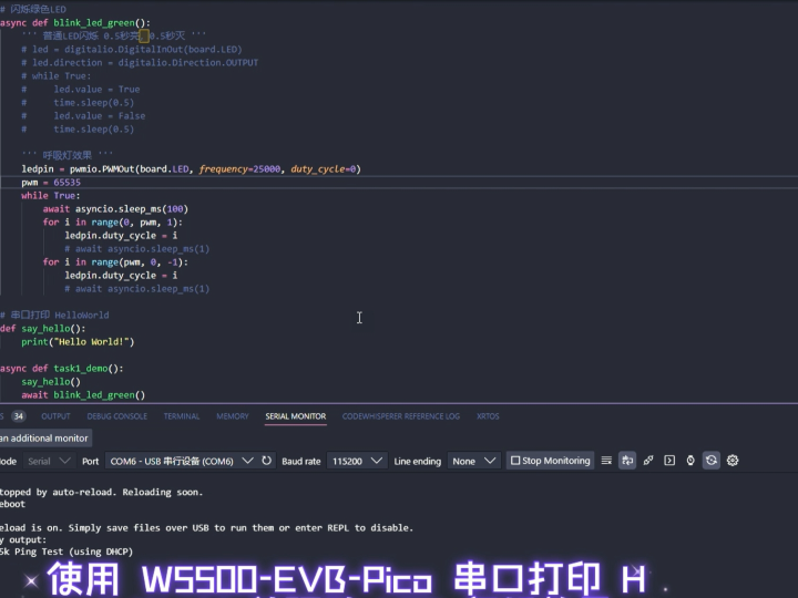 W5500-EVB-Pico Serial Port Printing and Breathing Light Effect