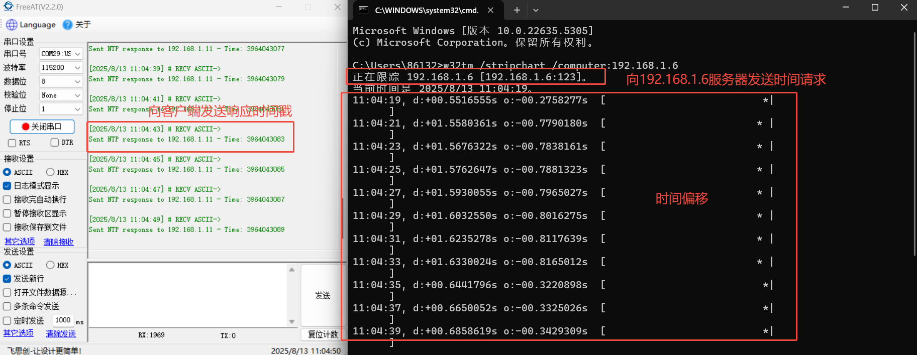 The command `w32tm /stripchart /computer:192.168.2.21` is used in Windows systems to check the time synchronization status between the local computer and a specified NTP (Network Time Protocol) server (here, 192.168.1.6). We send an NTP request to the W55MH32L-EVB via the command line: `w32tm /stripchart /computer:192.168.1.6`.