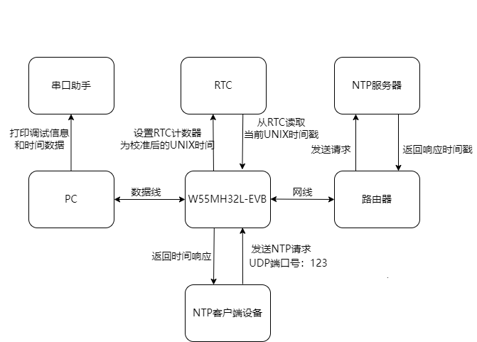 By initializing hardware (clock, serial port, etc.), network (WIZnet chip configuration, DHCP), and time modules (RTC, NTP), the main loop synchronizes the time from the NTP server to the local RTC every 10 minutes, prints the current time every second, responds to external NTP time requests, and processes UDP data, integrating NTP client, server, and RTC synchronization functions into one.