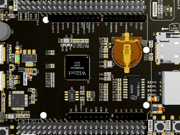 The W55MH32L-EVB is a development board based on the W55MH32L chip, with a main frequency of 216MHz, 1MB of flash memory and 96KB of SRAM. It also features a complete hardware TCP/IP offload engine, allowing for Ethernet applications to be implemented with simple socket programming.