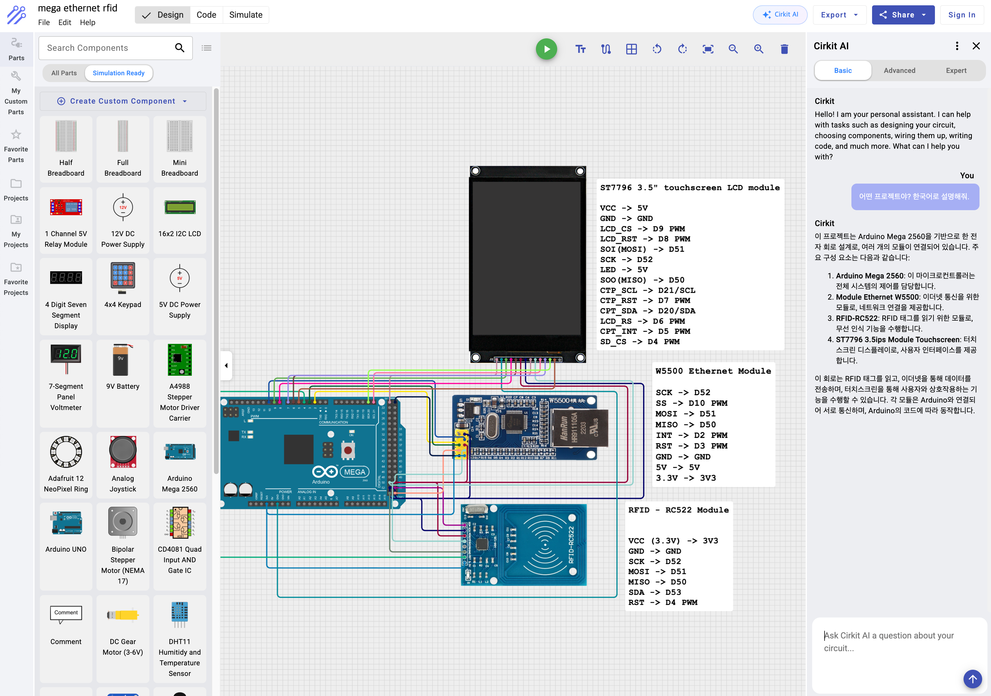 🖼️ Example : Mega + W5500 + RFID + Touch LCD with Cirkit AI panel and “Simulate” button visible.