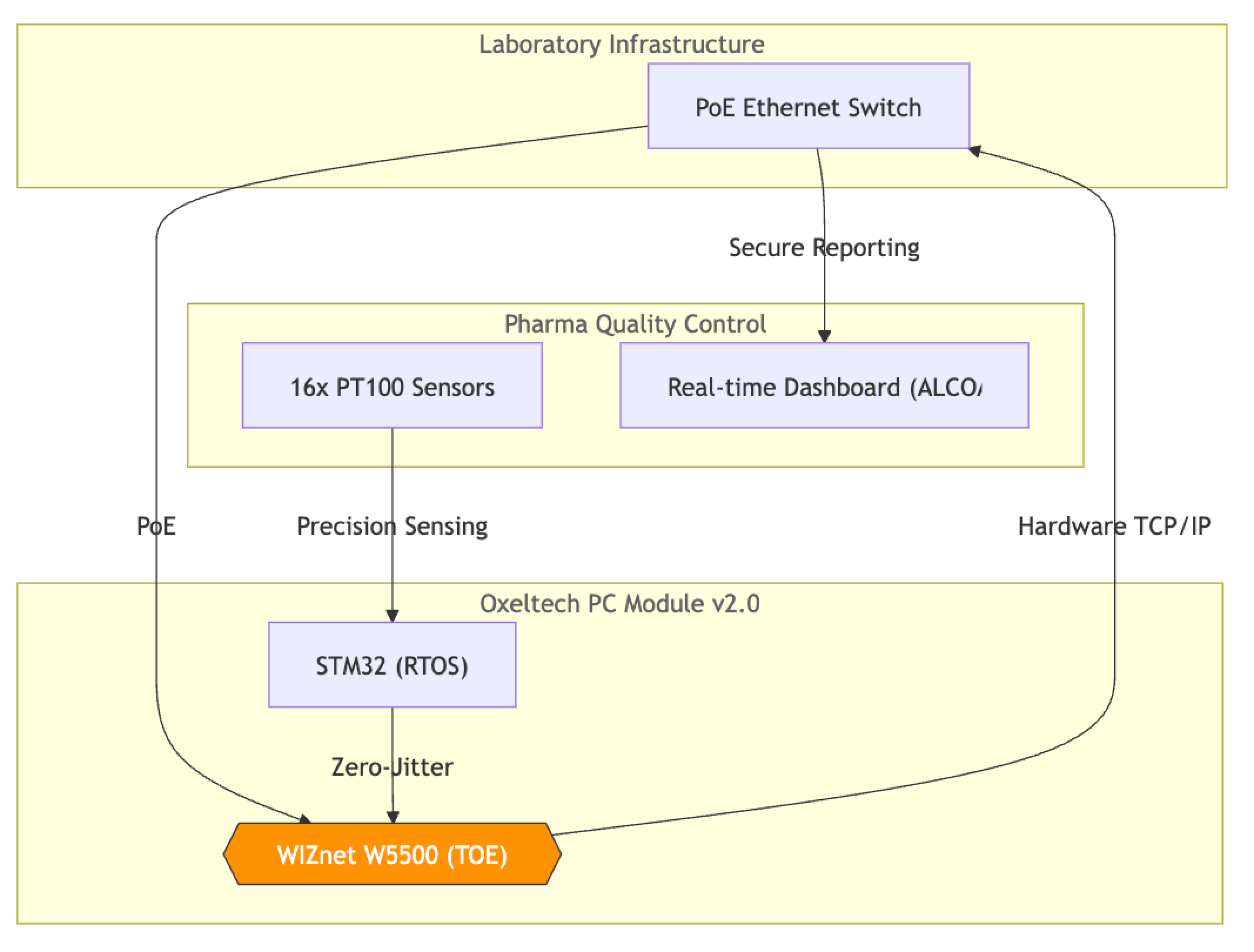 2. Why WIZnet? (Technical Necessity & Performance Upgrade) In a pharmaceutical laboratory, a missing data point can invalidate an entire batch test. WIZnet's W5500 provides a "Technical Necessity" that Wi-Fi or software-based Ethernet cannot match: