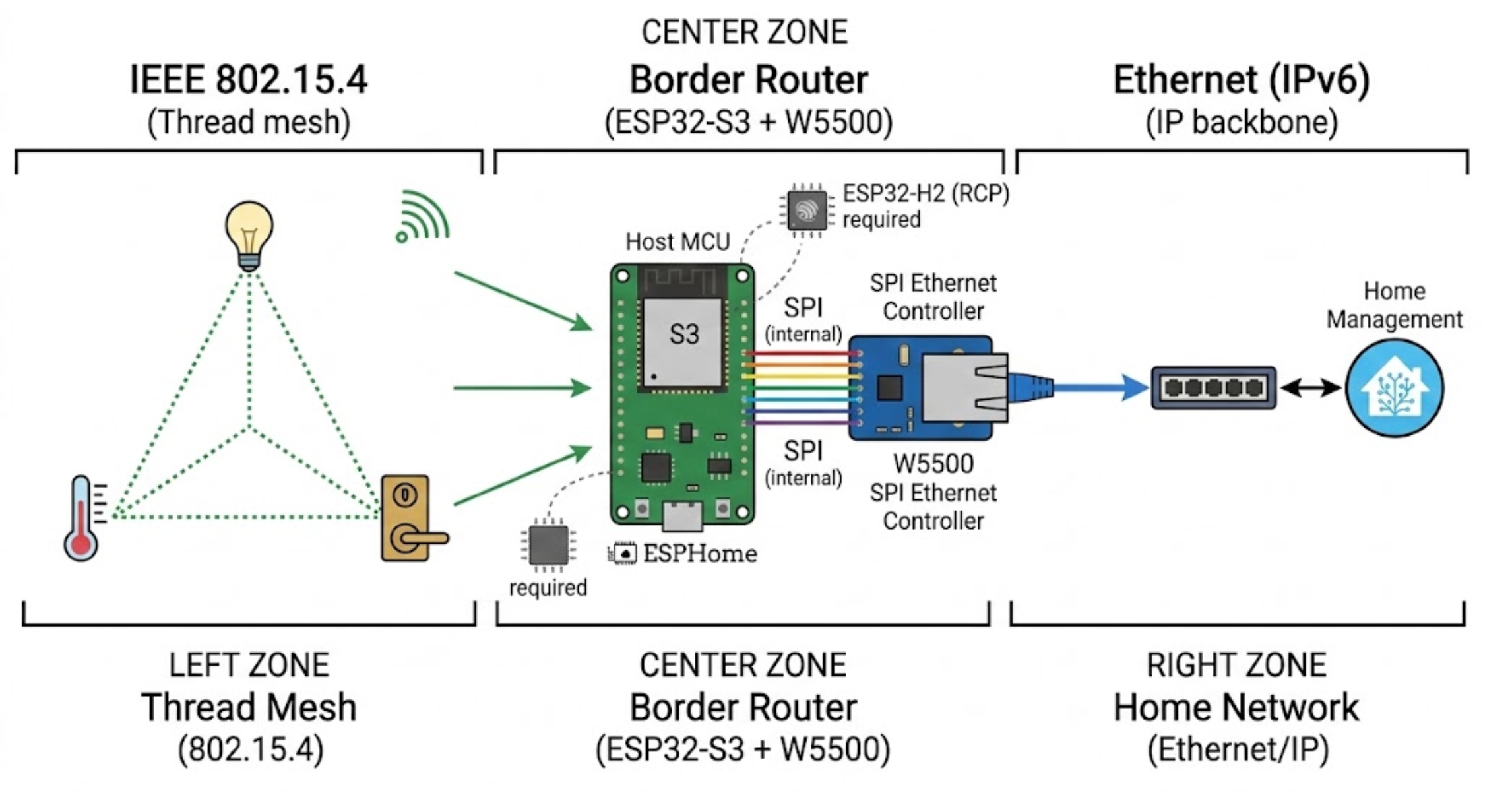 Q1: Does this project work as a Thread Border Router out of the box? Not yet. The YAML provides W5500 Ethernet connectivity to Home Assistant via ESPHome, but the ESP32-S3 lacks an 802.15.4 radio for Thread mesh communication. An additional ESP32-H2 module (as a Radio Co-Processor) and OpenThread configuration would be needed to complete the Thread Border Router functionality.