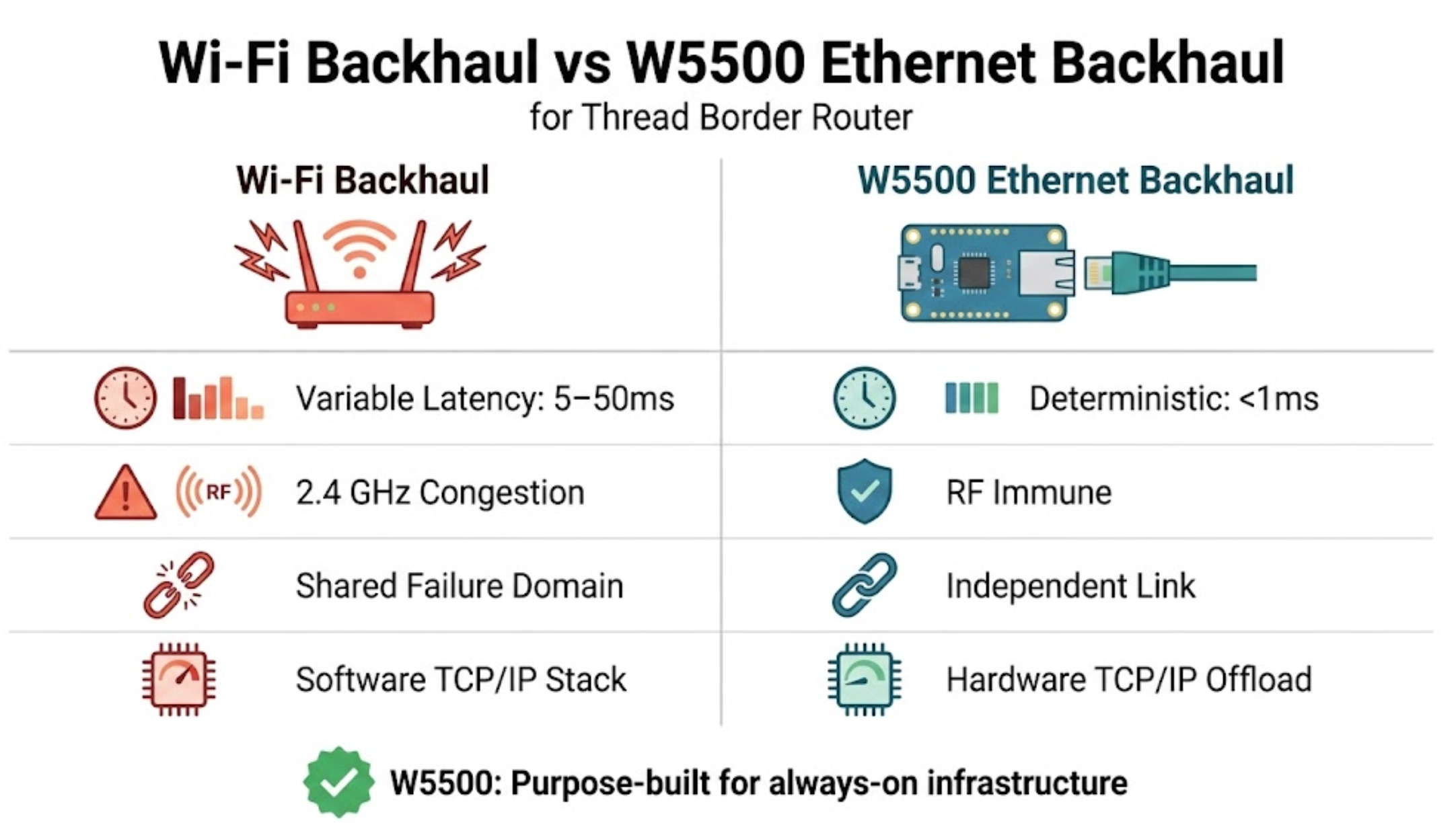 Wi-Fi-based backhaul introduces several risks: channel congestion in the crowded 2.4 GHz band, variable latency under load, and dependency on the same wireless infrastructure that may itself be the failure point. The W5500's hardwired TCP/IP stack eliminates all of these:
