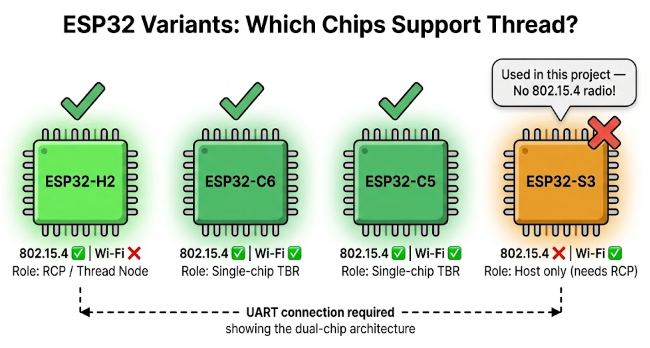 | ESP32-H2 | ✅ | ❌ | RCP (Radio Co-Processor) or standalone Thread node |