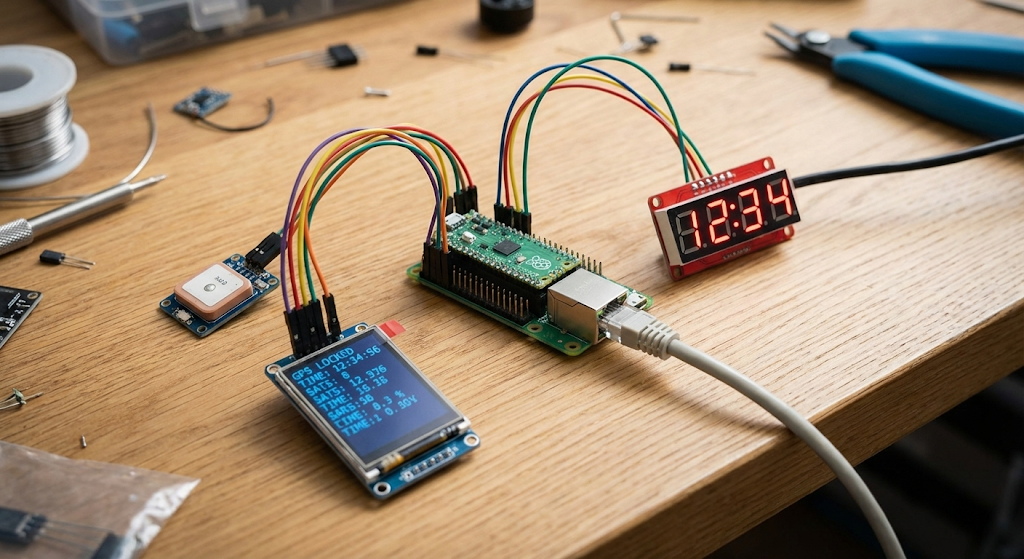 This project implements a MicroPython-based NTP server using a GPS module for accurate time, displaying live GPS data on both an ST7789V color LCD and a 4-digit 7-segment display (HT16K33). Designed for the Raspberry Pi Pico (or similar), with WIZNET5K Ethernet, GPS, and display modules.