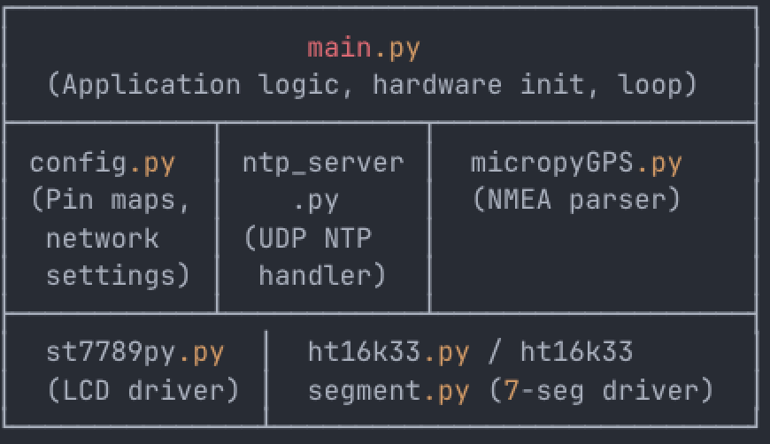 Q3: What programming language and framework does this project use? The project is written entirely in MicroPython (Python 100% per the GitHub language analysis). It uses the MicroPython WIZNET5K network driver for Ethernet, the micropyGPS library for NMEA parsing, and custom drivers for the ST7789V (SPI) and HT16K33 (I2C) displays.