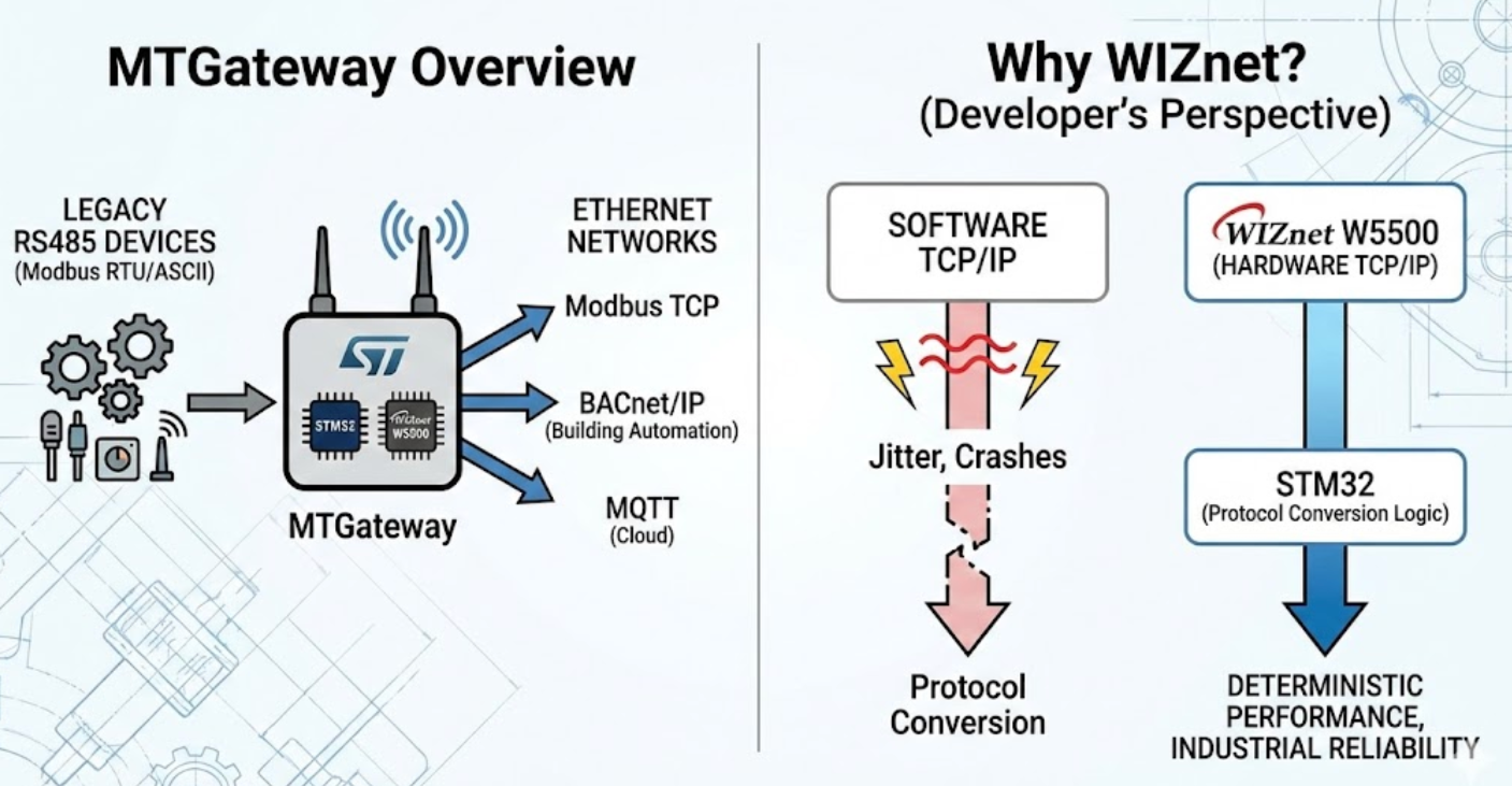 Industrial gateway solution based on STM32 and W5500, supporting multiple protocols (Modbus TCP/RTU/ASCII, BACnet/IP, MQTT) for building automation and IIoT.