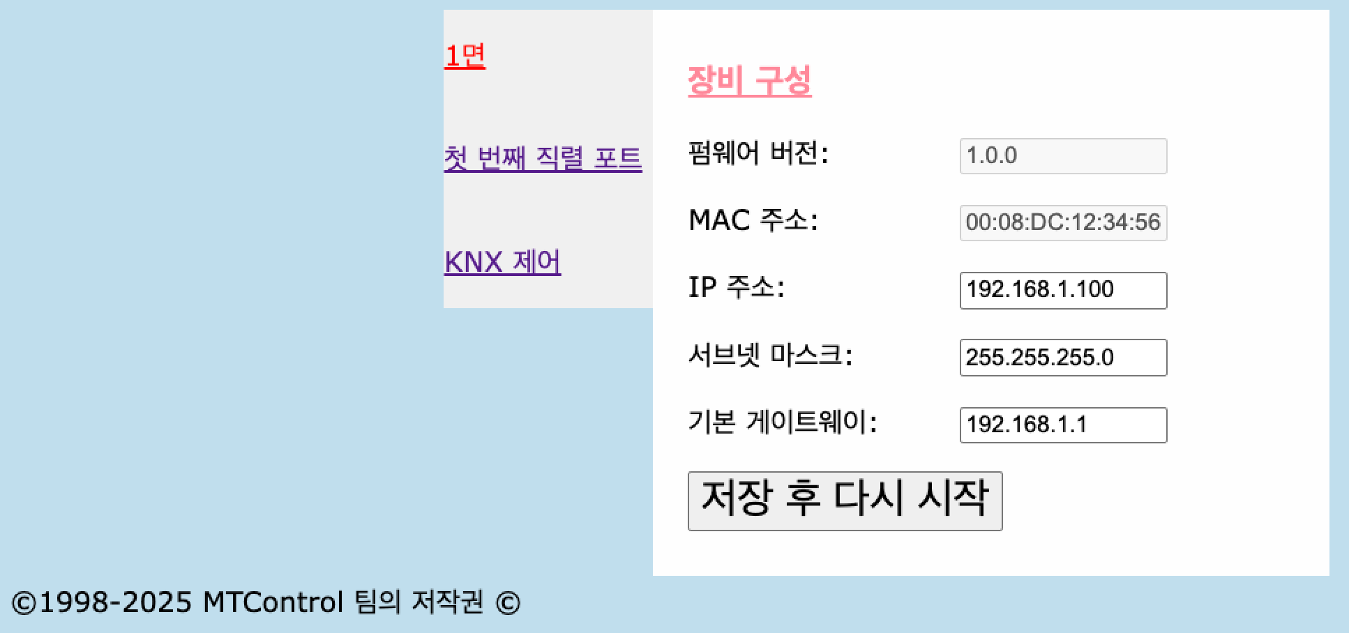 기능 발견: HTTPD: 경량 HTTP 서버를 내장하여, 사용자가 전용 소프트웨어 없이 웹 브라우저만으로 IP와 시리얼 설정을 변경할 수 있습니다.