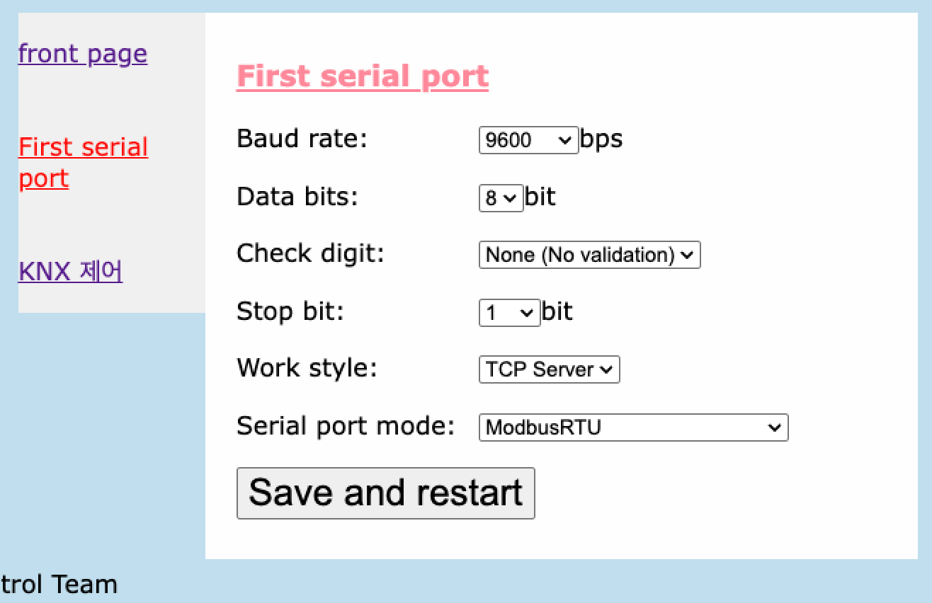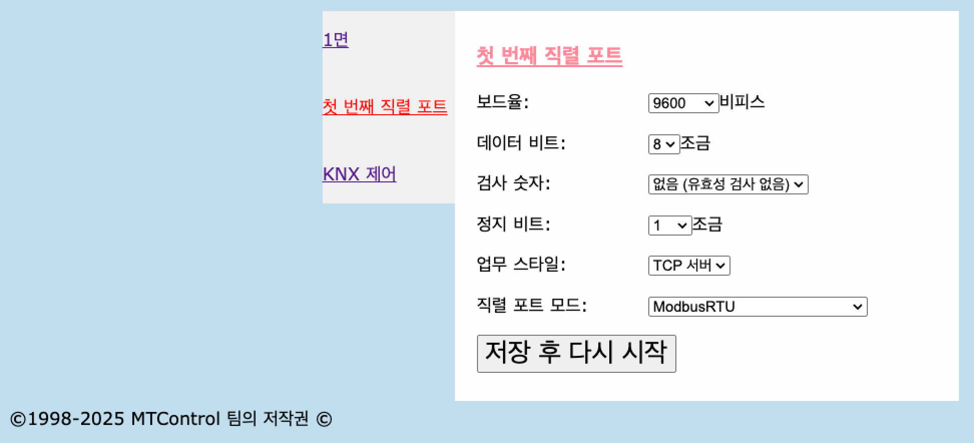 Figure 1: 시리얼 포트 설정 페이지 (port0.html). 모드버스 모드(TCP<->RTU/ASCII) 변환 기능이 상세히 구현되어 있습니다.