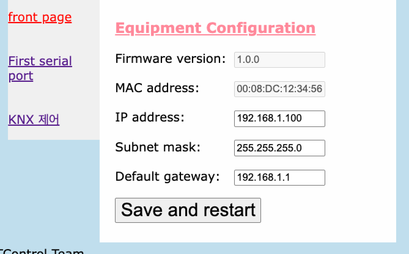 임베디드 웹 서버 구현: 전용 설정 툴을 배제하고 W5500의 독립 소켓을 활용해 웹 서버를 구동합니다. 펌웨어(html_pages.h) 내에 index.html(상태), port0.html(시리얼 설정), knx.html(조명 제어) 등 실제 웹 페이지 코드가 내장되어 있어, 브라우저만으로 즉시 제어가 가능합니다.