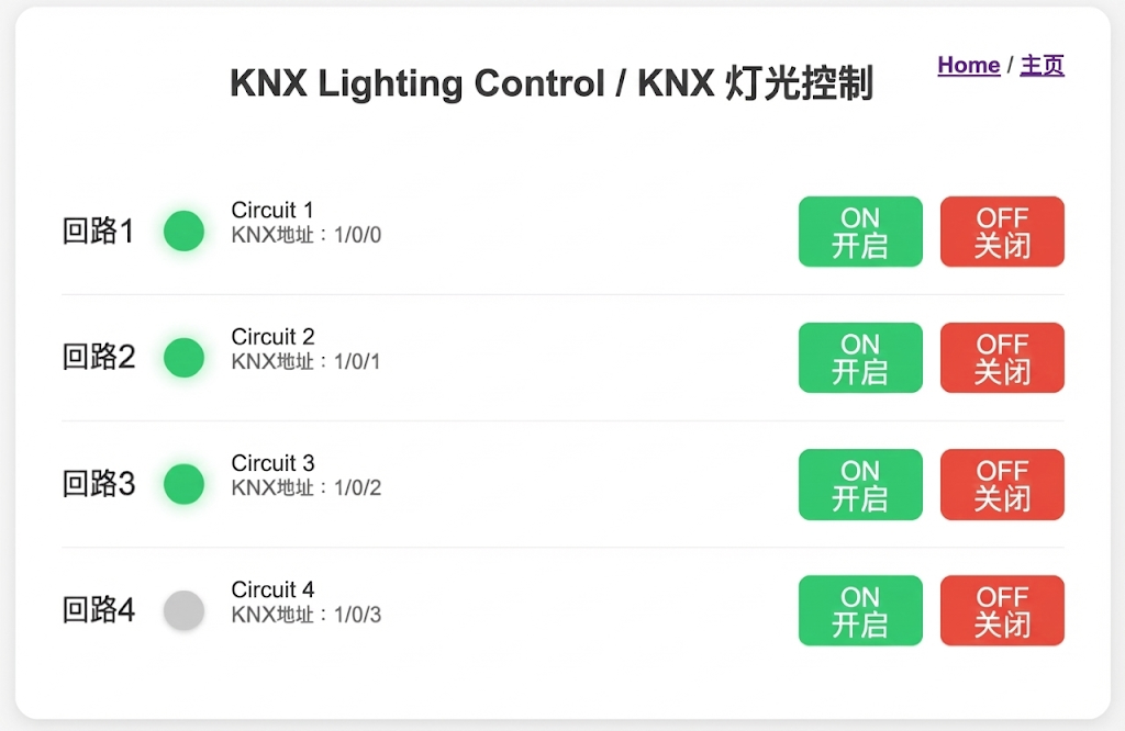 Figure 2: The KNX Lighting Control Page (knx.html). A clean, dashboard-style UI for testing Binary Outputs.
