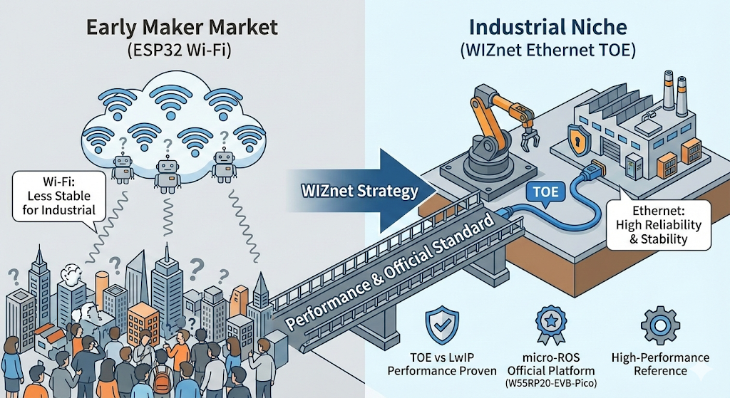 - 현재 시장: 초기 Maker 시장은 ESP32 기반의 Wi-Fi 솔루션이 주류를 이루고 있습니다. 하지만 무선 연결은 산업용 로봇이 요구하는 엄격한 안정성을 충족시키기 어렵습니다.