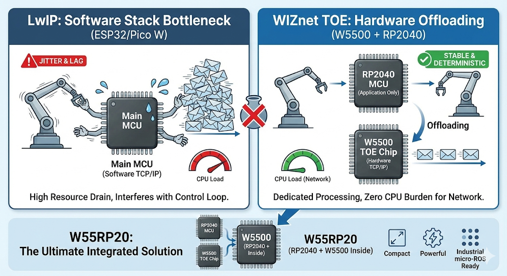- The LwIP Bottleneck: In ESP32 or Pico W, the TCP/IP stack (LwIP) runs in software on the main MCU. This consumes significant CPU cycles and memory. More critically, heavy network traffic can interrupt the robot's control loops, causing jitter.
