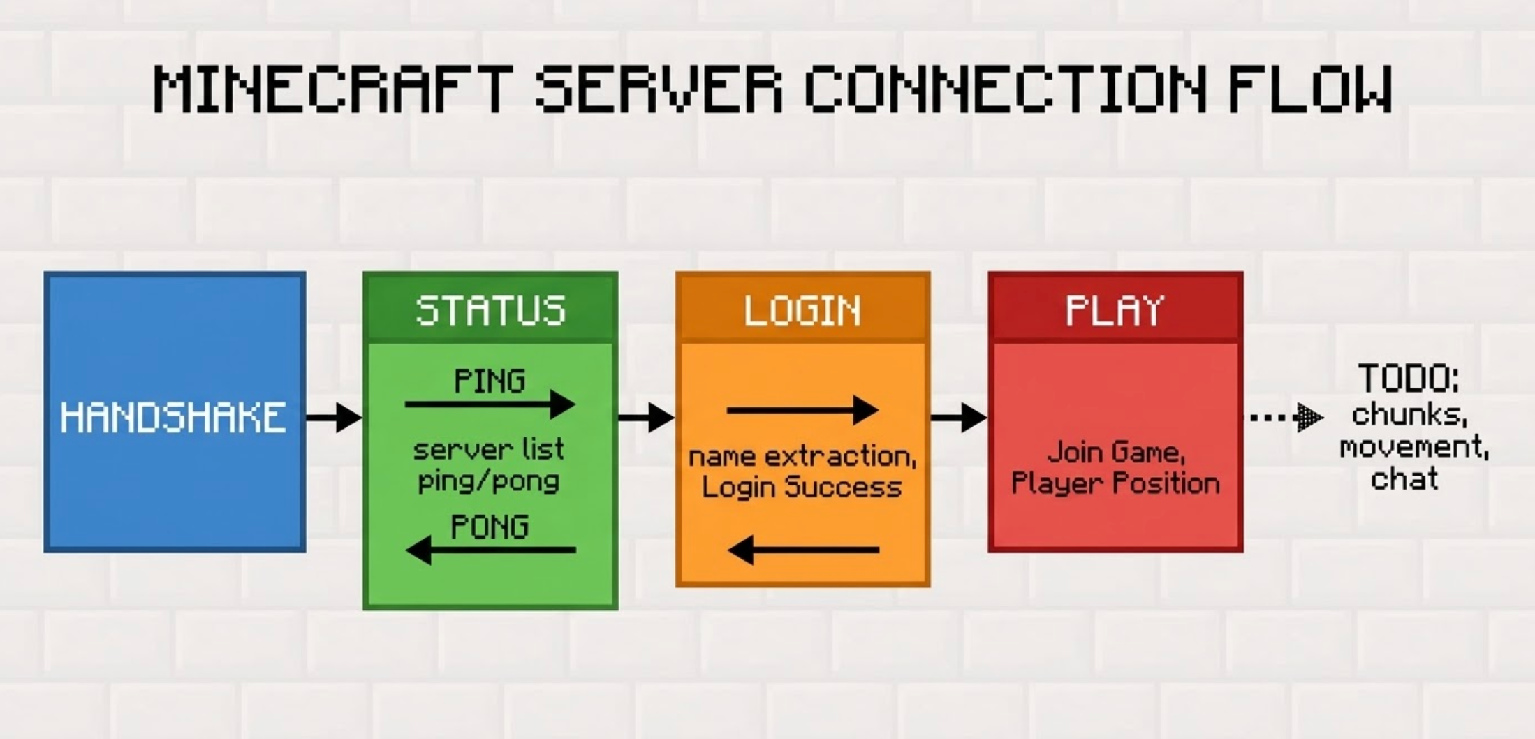 Q1: Can a Minecraft client actually connect to this server? Yes, but only partially. The server handles Handshake, Status (server list ping), Login, and initial Join Game. The client reaches the terrain loading screen but cannot proceed further because no chunk data is sent.