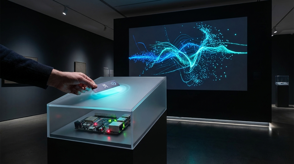 The NFC_ESP32_W5500_PODIUM is an interactive media control system designed for live performance, museum installations, and interactive exhibitions.