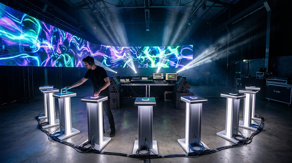 At the protocol level, it implements OSC (Open Sound Control) over UDP, the de facto standard for real-time media control in professional audio-visual environments.