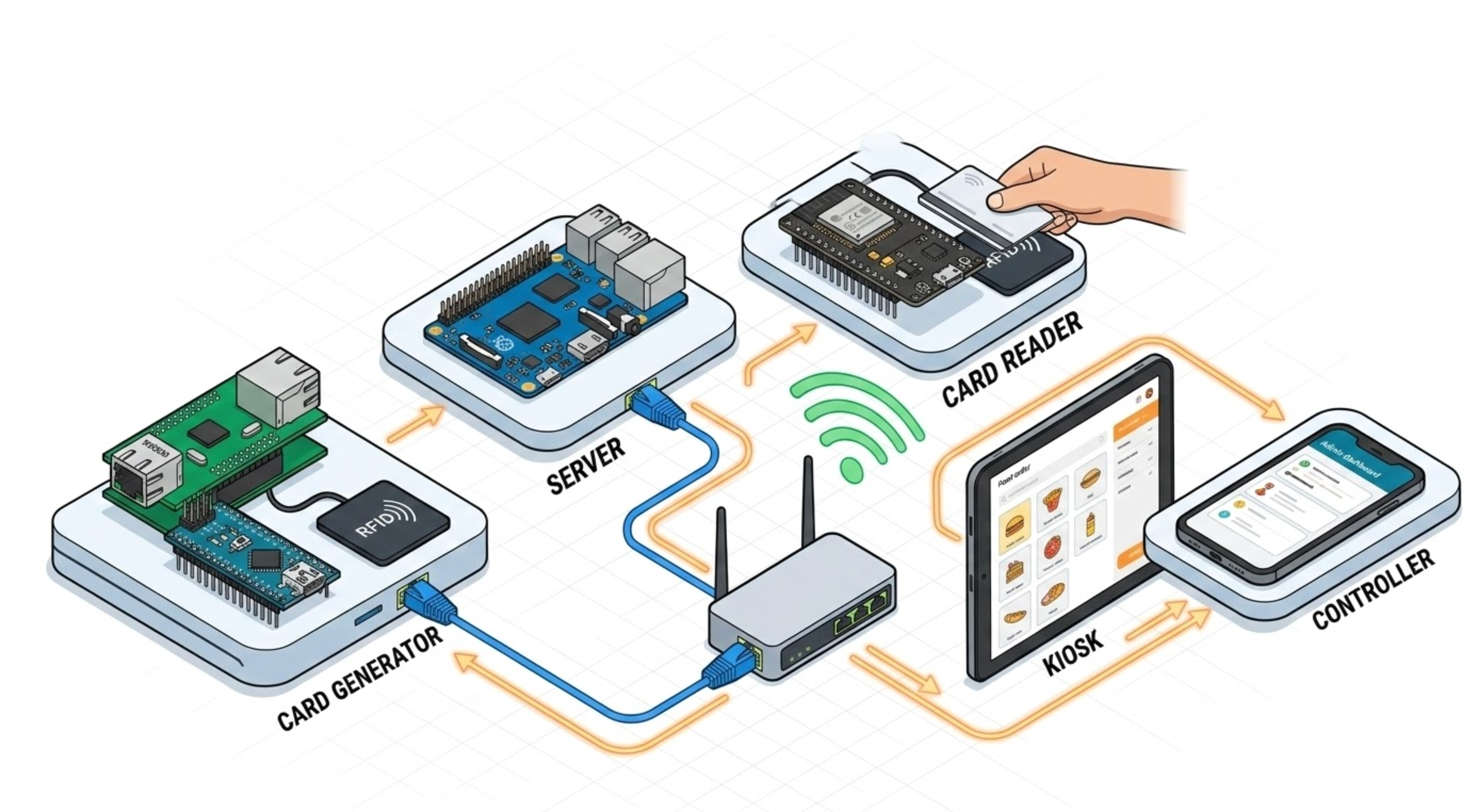The Generator is intended to sit next to the Orange Pi server, making a wired Ethernet connection both practical and preferable. Meanwhile, the Reader uses ESP32 Wi-Fi because it needs to be placed wherever the student-facing kiosk is located — potentially across the canteen, away from network infrastructure.