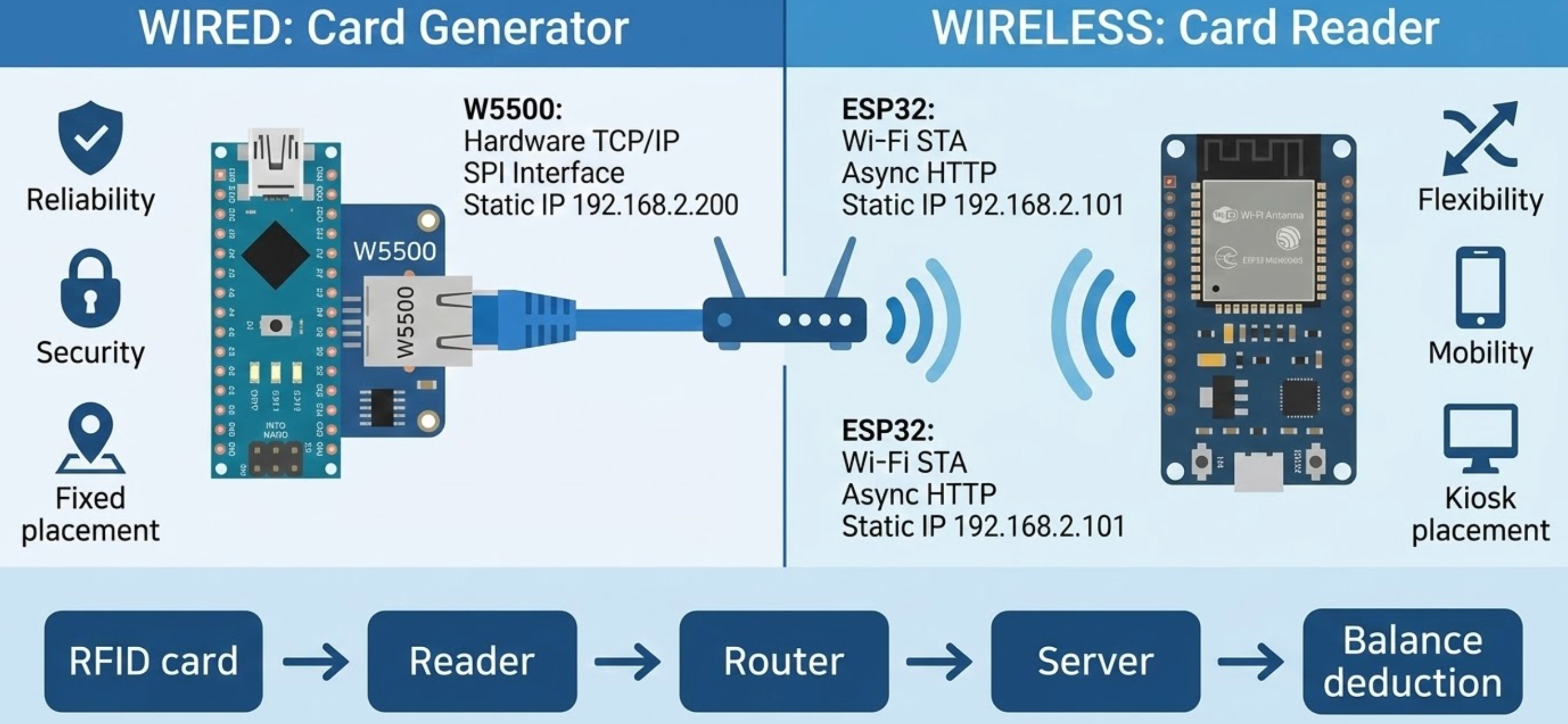 Reliability at the provisioning point. Card generation is a critical operation — if a write to the RFID card succeeds but the network confirmation fails, the system could end up with orphaned cards. The W5500's hardwired TCP/IP stack provides deterministic connectivity without the latency variability of Wi-Fi association and DHCP negotiation. The Generator uses a static IP configuration (192.168.2.200) with the W5500's hardware TCP/IP offloading, leaving the ATmega328's limited resources free for SPI communication with both the W5500 and the RFID module.