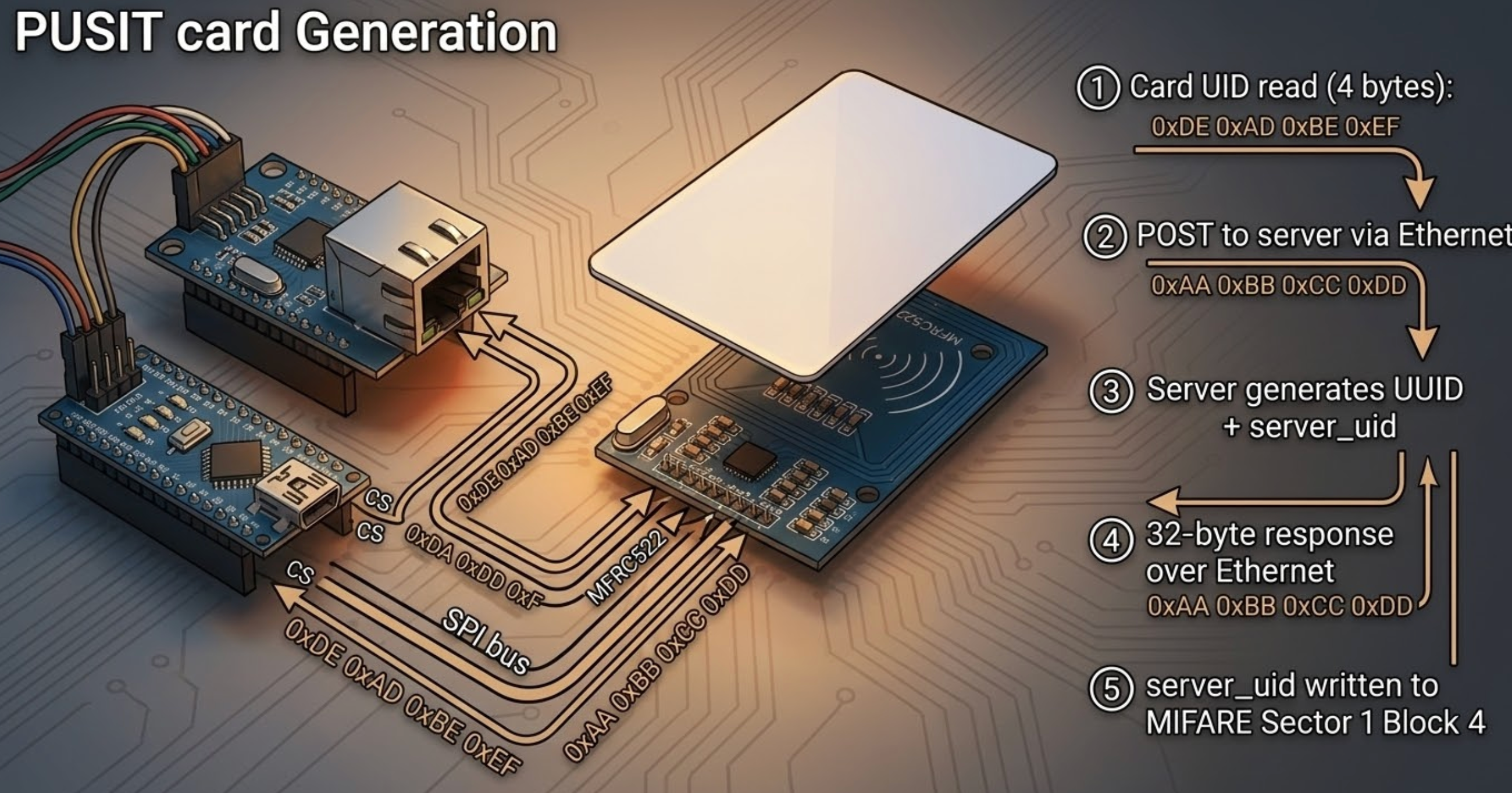 When an RFID card is tapped on the Generator's RC522 reader, the Arduino sends the card's 4-byte UID to the Rust server via HTTP POST over the W5500 Ethernet connection: