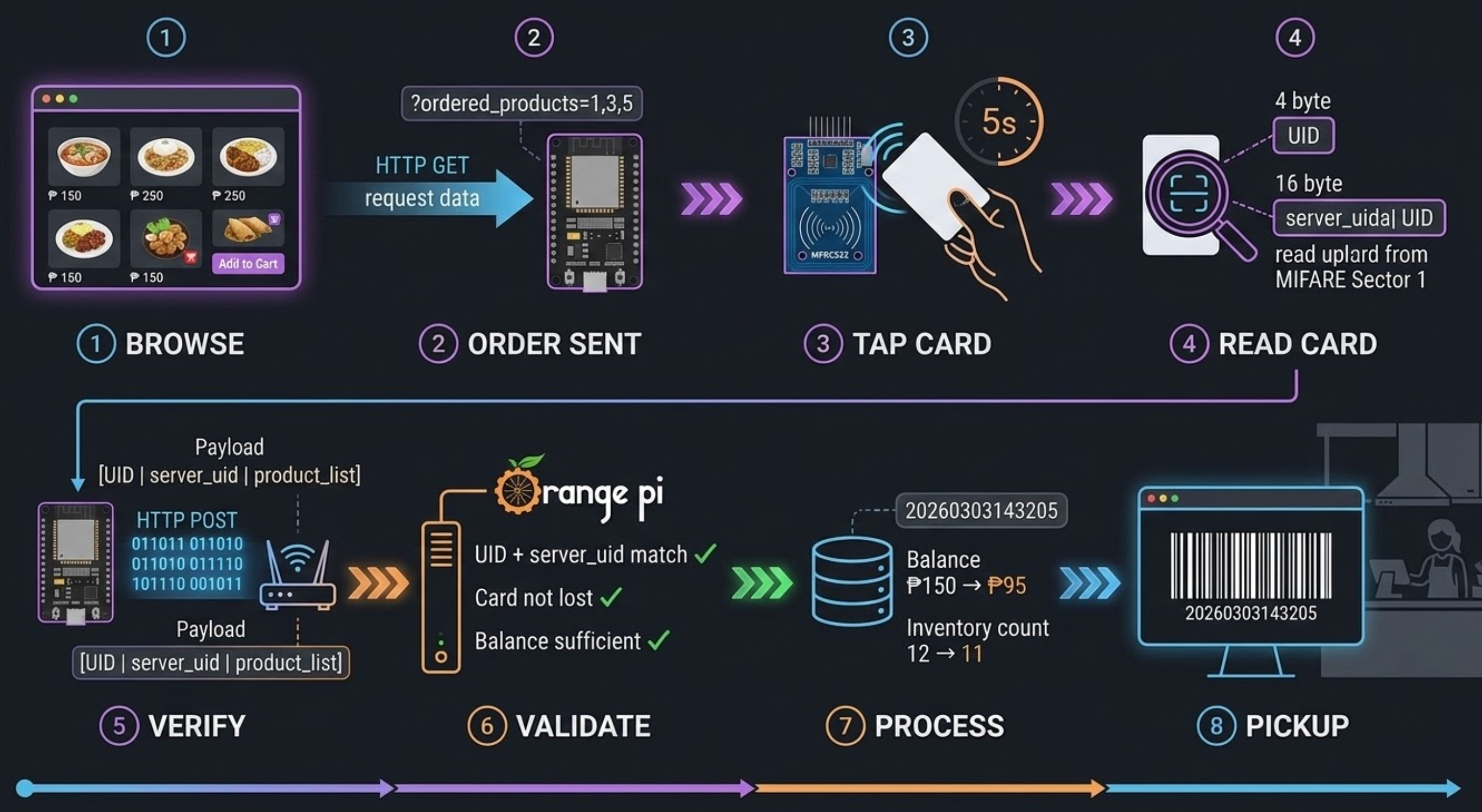 - Server validates the card: checks if both UID and server_uid match, confirms the card isn't marked as lost, and verifies sufficient balance (in Philippine Pesos, ₱)