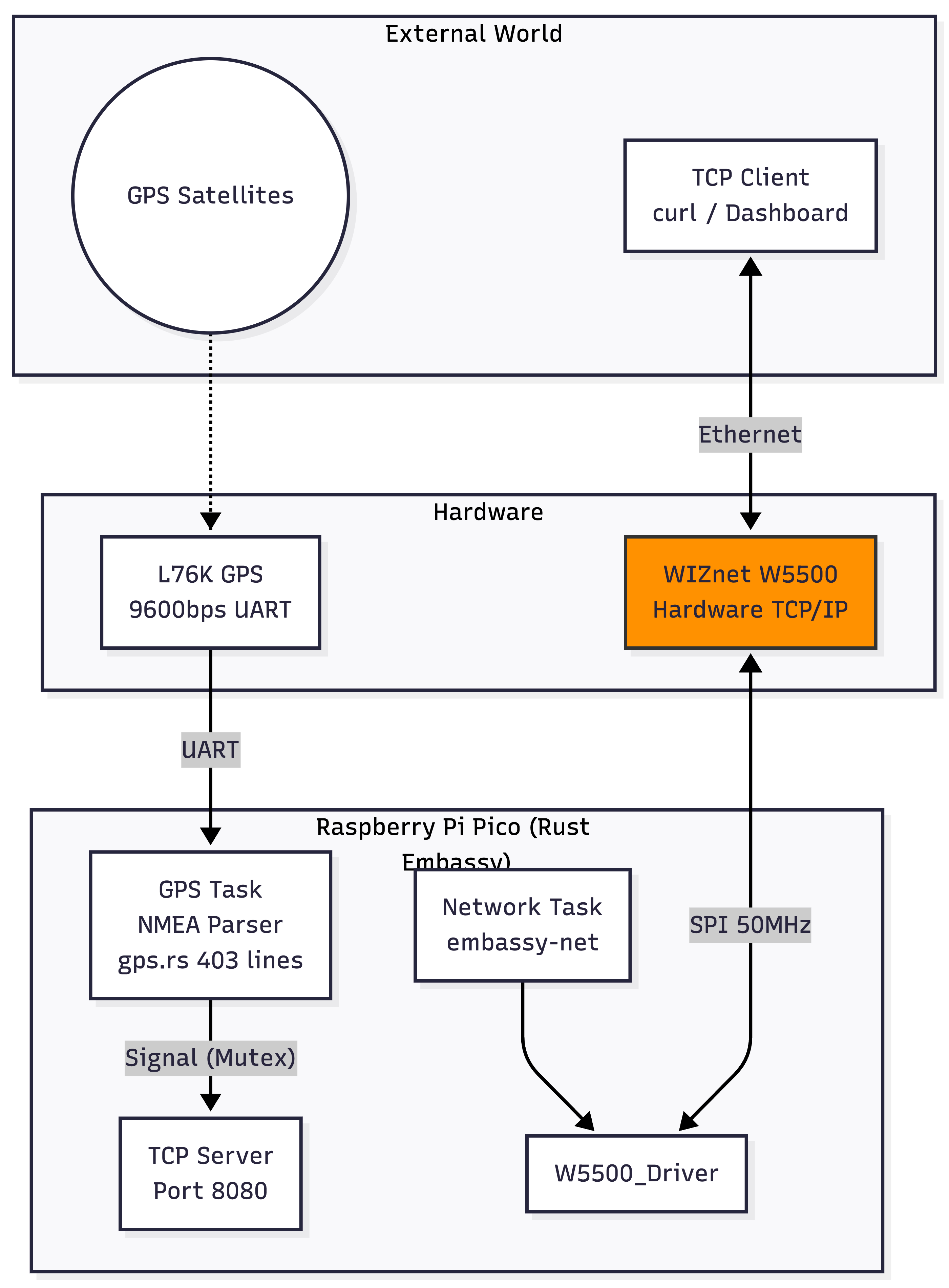 Async Rust (Embassy) GPS server on RP2040 + W5500. Delivers real-time GPS data via TCP API with full NMEA parsing and memory-safe concurrent task handling.