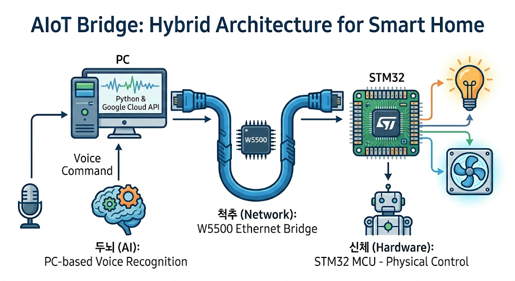 - 컨셉: 이 프로젝트는 스마트 홈 애플리케이션을 위해 설계된 견고한 음성 제어 시스템을 제시합니다. 불안정한 무선 연결에 의존하는 일반적인 상용 솔루션과 달리, 이 시스템은 PC 기반의 AI 처리와 신뢰성 있는 임베디드 하드웨어 제어를 결합한 하이브리드 아키텍처를 활용합니다.