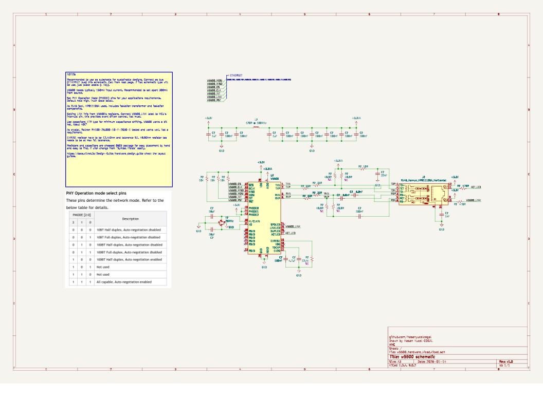터키의 임베디드 시스템 엔지니어 Hasan Yücel Çoğal이 제작한 WIZnet W5500 이더넷 컨트롤러용 KiCad 참조 회로도입니다. 이 설계는 물리적으로 테스트되었으며(리포지토리에 보드 사진 포함), W5500 이더넷 기능을 프로젝트에 추가하려는 KiCad 사용자를 위한 시작점을 제공합니다.