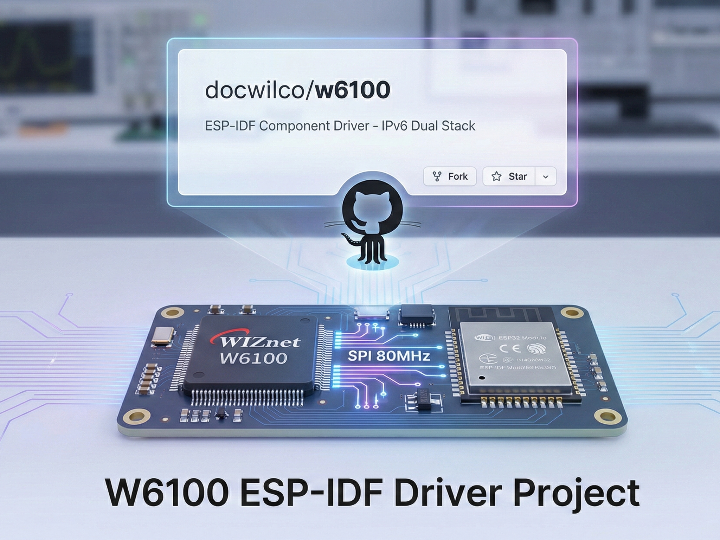 ESP-IDF component driver for the WIZnet W6100 hardwired TCP/IP Ethernet controller with IPv4/IPv6 dual-stack support.