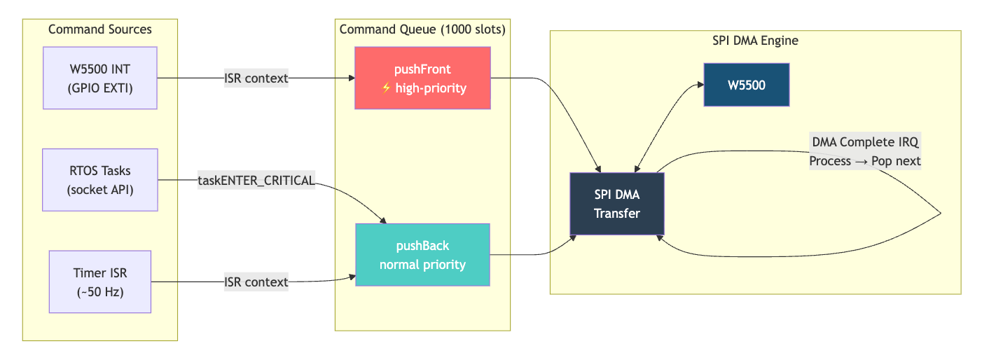 The central design element is a circular command queue (1,000 slots) that serializes every SPI transaction to the W5500. The application layer never touches SPI directly; instead, it pushes command structs onto the queue. A single running_cmd variable tracks the in-flight DMA transfer. When a transfer completes, the DMA callback processes the result and immediately pops the next command:
