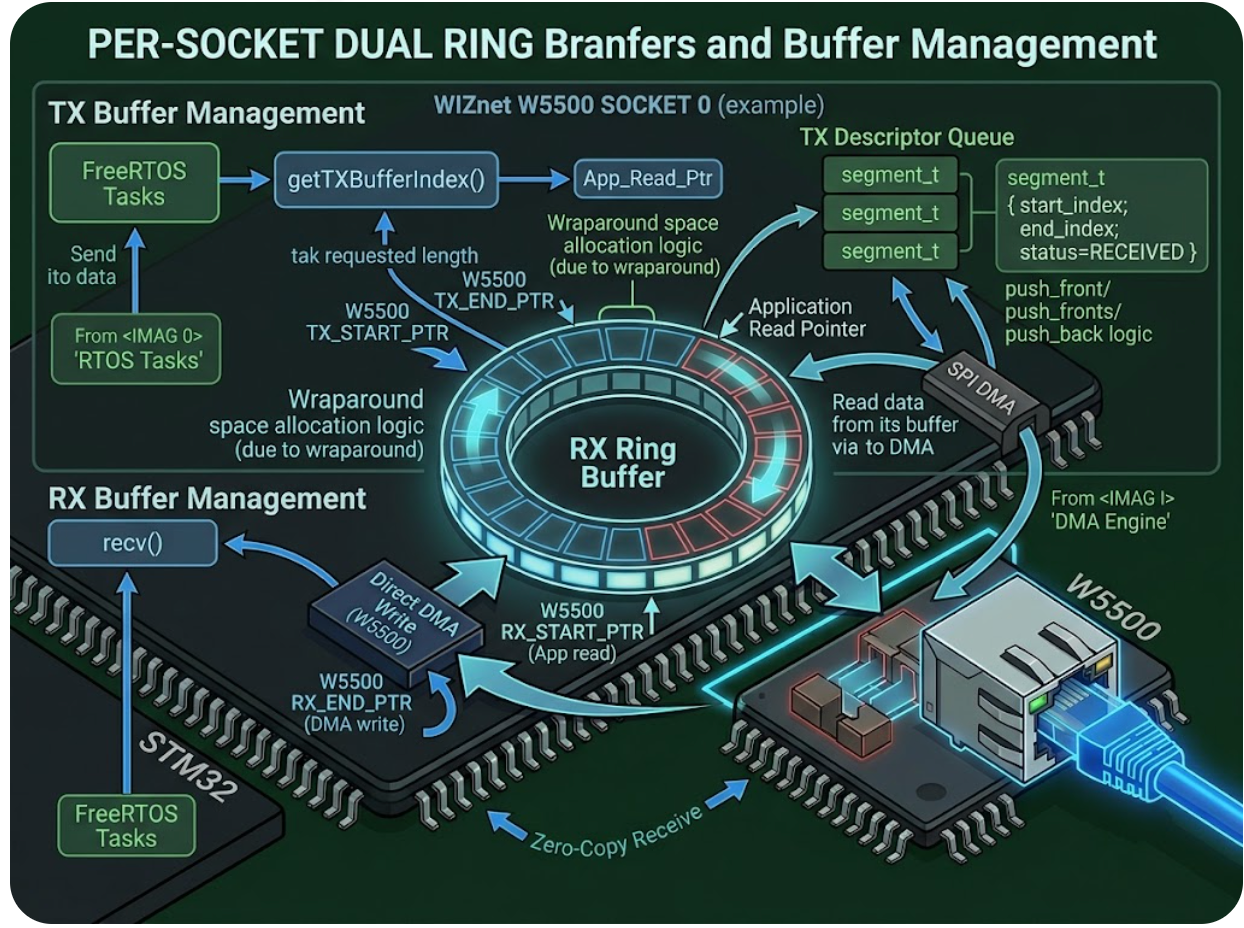 Every SPI transaction uses STM32 HAL DMA (HAL_SPI_Transmit_DMA, HAL_SPI_TransmitReceive_DMA), meaning the CPU is free during transfers. Each socket has its own ring-buffer pair (TX and RX) in STM32 RAM, managed by segment descriptor queues. The getTXBufferIndex() and getRXBufferIndex() functions implement wraparound-aware allocation: