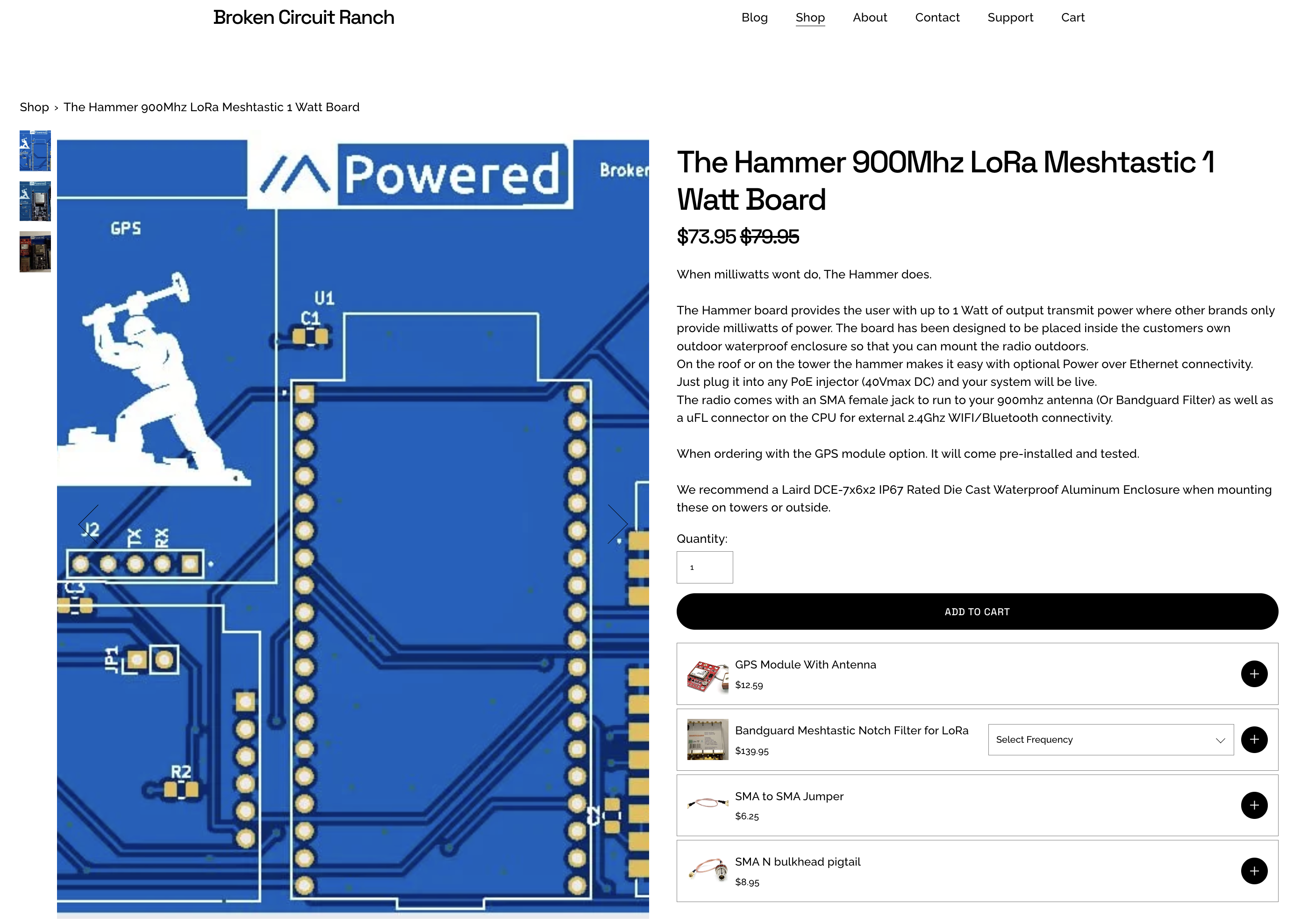 The Hammer는 미국 텍사스의 Broken Circuit Ranch에서 개발한 1W 출력 LoRa Meshtastic 보드입니다.