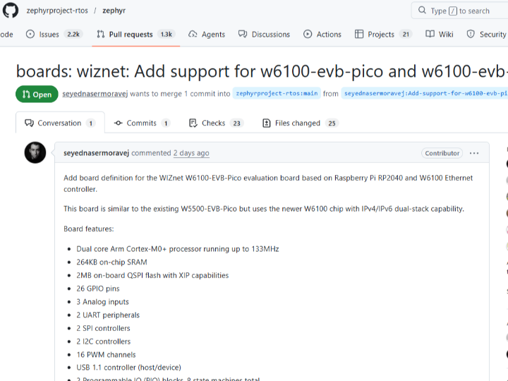 Although this PR (#104394) was opened very recently, it has already attracted significant attention from the Zephyr community. Notably, 6 reviews have already been posted by key maintainers, signaling strong interest in the official support for the RP2350 and W6100 combination.