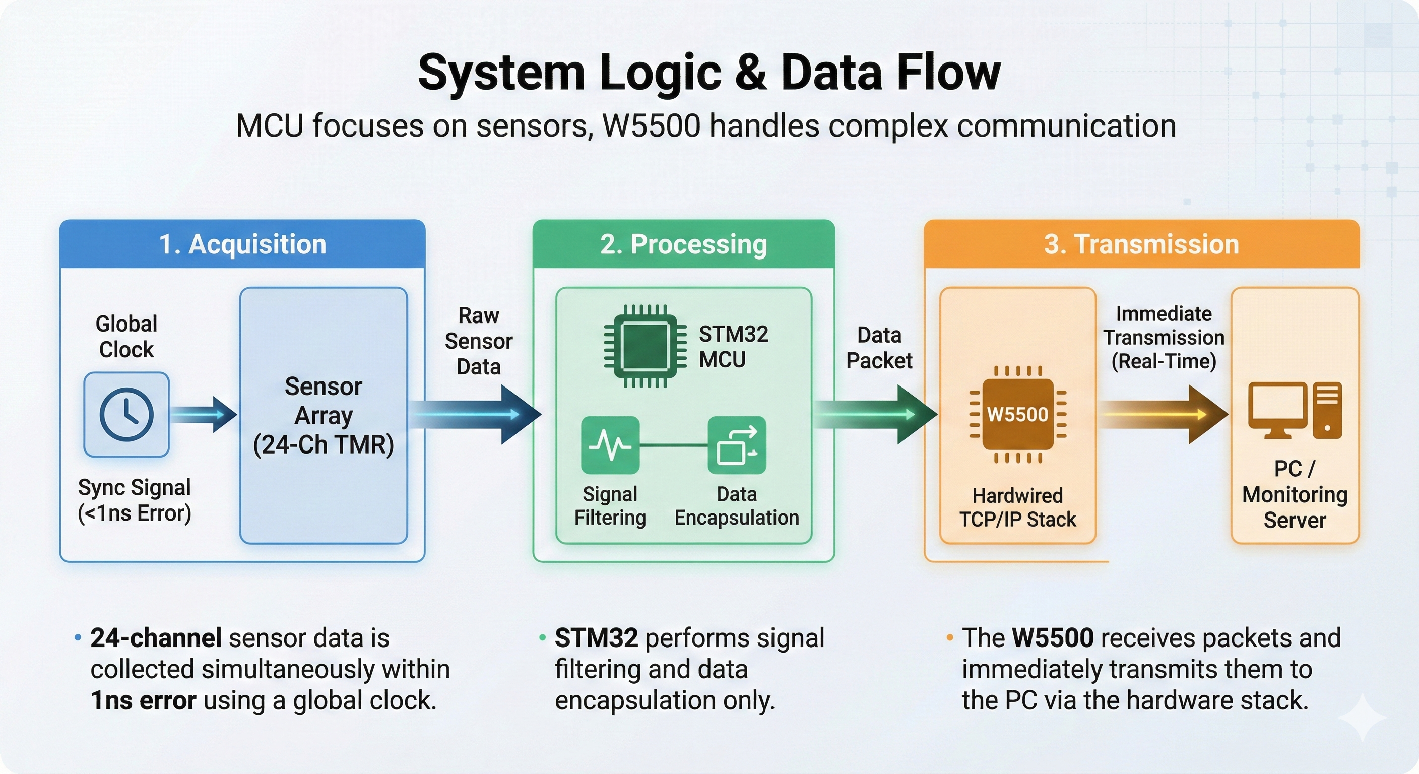 Role of W5500: The Hardwired TCP/IP Stack offloads network processing, allowing the MCU to focus 100% on sensor control.