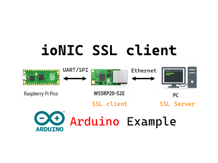 The W55RP20-S2E is configured in SSL client mode via the UART or SPI interface and operates to exchange data with an OpenSSL server running on a PC.