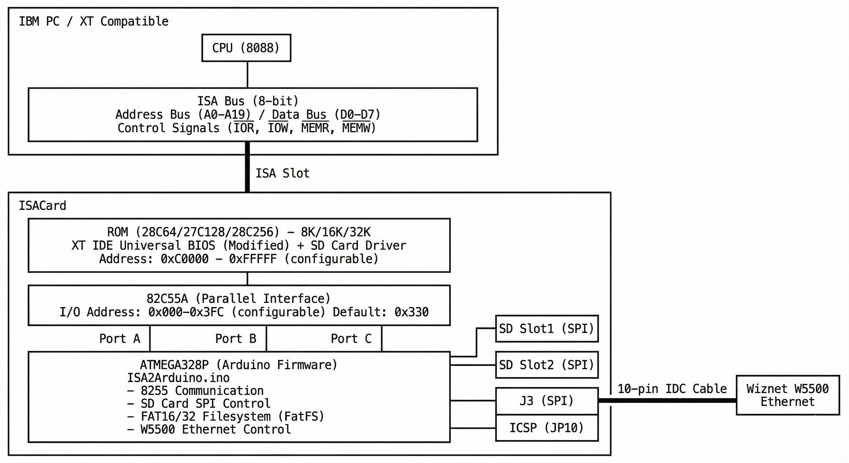 Originally inspired by the Apple II SDCard interface project, the ISACard adapts and extends the concept for PC architecture—providing two major enhancements to legacy systems: large-capacity storage and network connectivity.