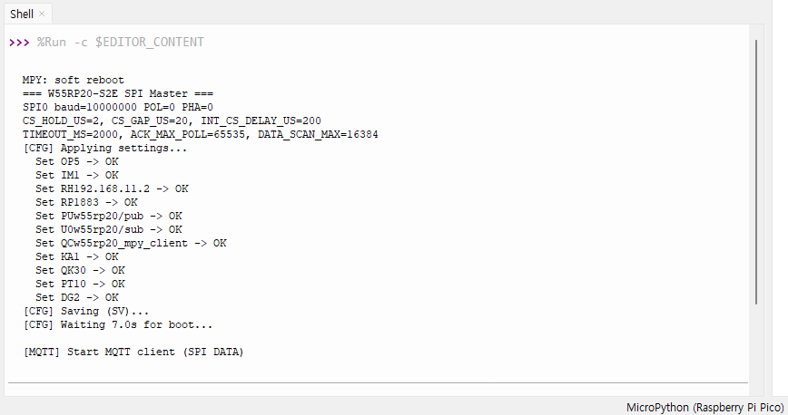 This example demonstrates MQTT client on W55RP20 S2E via UART/SPI using MicroPython on a Raspberry Pi Pico (Master)