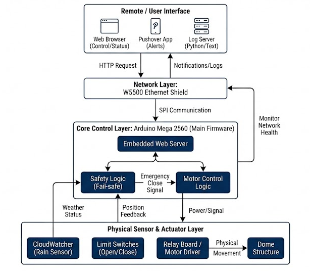 The system automatically detects hazardous conditions such as rain, network failures, or sensor communication loss, and safely closes the observatory dome without human intervention.