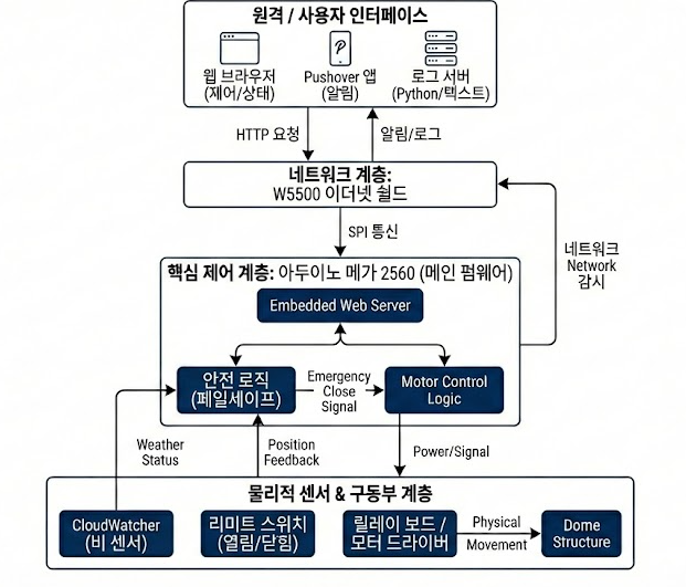 A:W5500 이더넷 실드는 SPI 인터페이스를 통해 Arduino MEGA 2560에 연결되며, MOSI, MISO, SCK, CS 신호선과 전원이 필요합니다. 초기화는 표준 Arduino Ethernet 라이브러리를 사용합니다. W5500이 TCP/IP 처리를 내부적으로 수행하기 때문에, MCU는 네트워킹 오버헤드 대신 돔 모터 제어, 센서 모니터링, 안전 로직 처리에 집중할 수 있습니다.