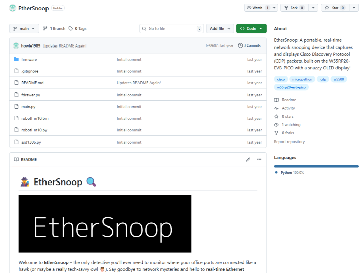 A portable, real-time network snooping device that captures and displays Cisco Discovery Protocol packets, built on the W55RP20-EVB-PICO with a snazzy OLED