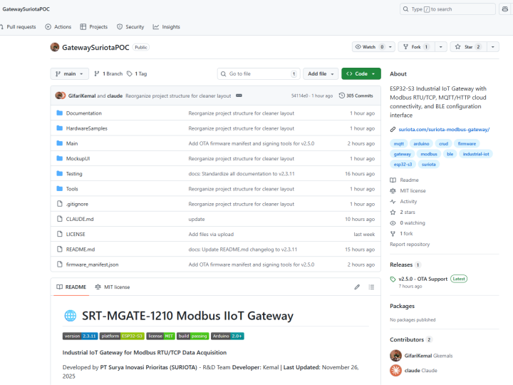GatewaySuriotaPOC ESP32-S3 Industrial IoT Gateway with Modbus RTU/TCP, MQTT/HTTP cloud connectivity, and BLE configuration interface COMPONENTS PROJECT DESCRIPTION Documents Comments Write