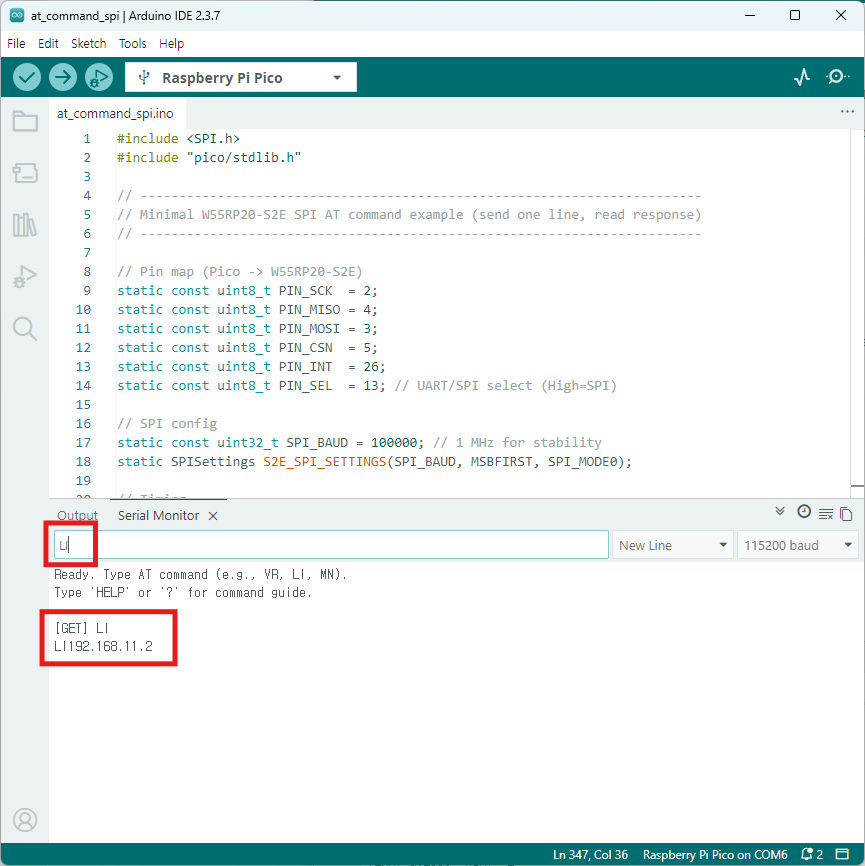 For example, enter the 'LI' command, which represents the Local IP value, to send it to the W55RP20 S2E and receive the Local IP address in response.